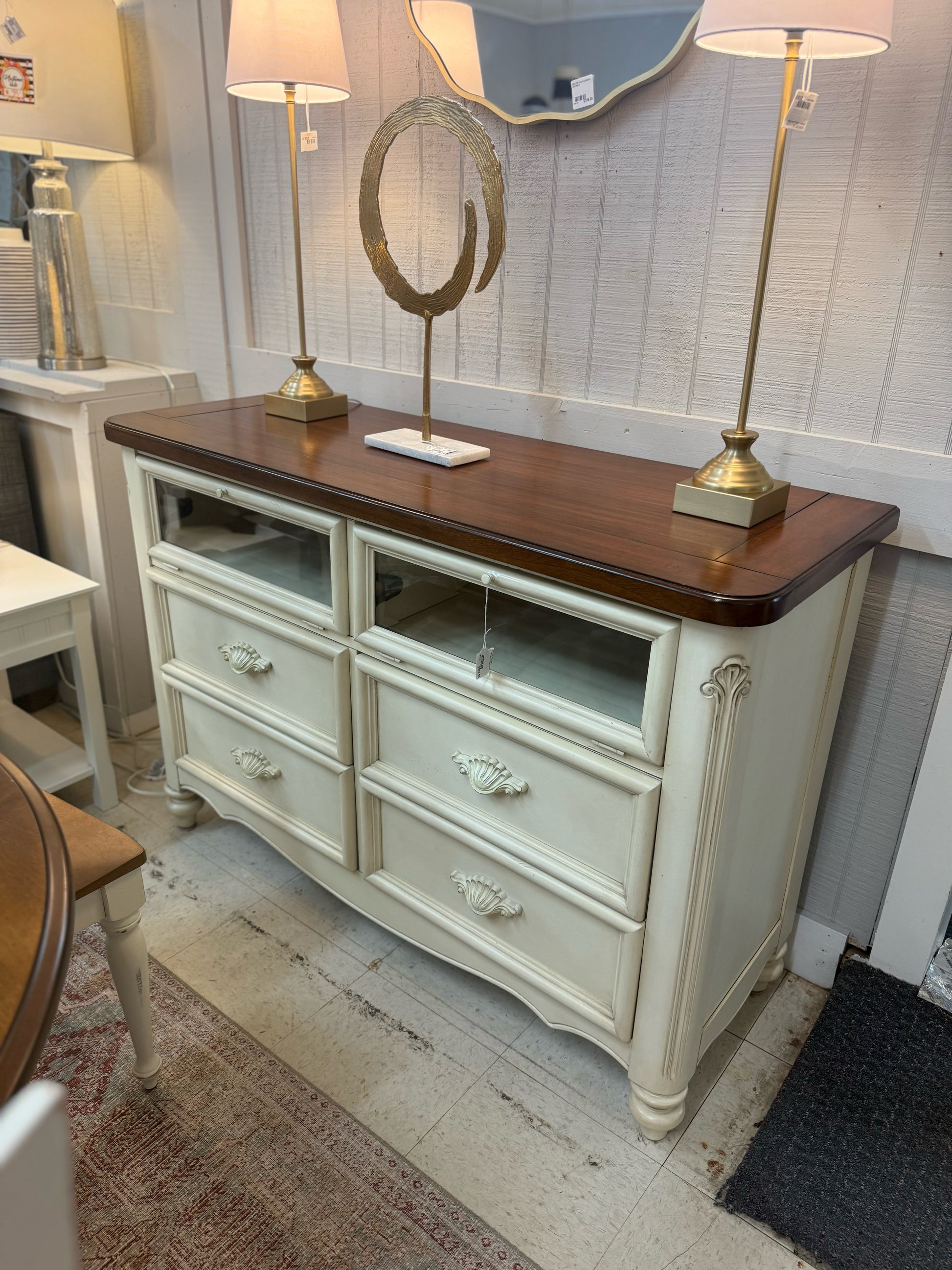 52x19x36 American Woodcrafters Cream Chest with 4 drawers and 2 Glass Doors