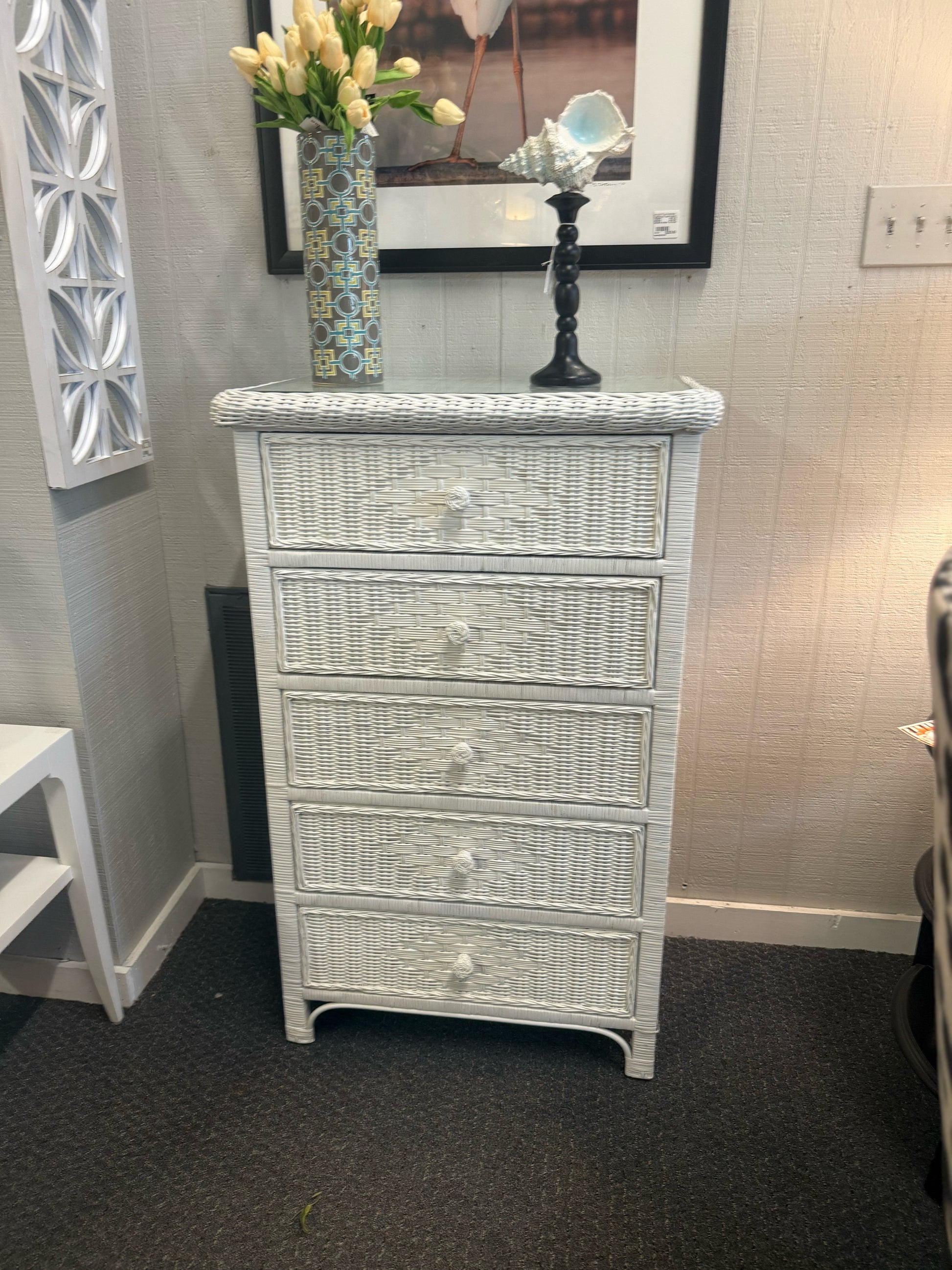 29X18X46 White Wicker 5 Drawer Chest with Glass Top