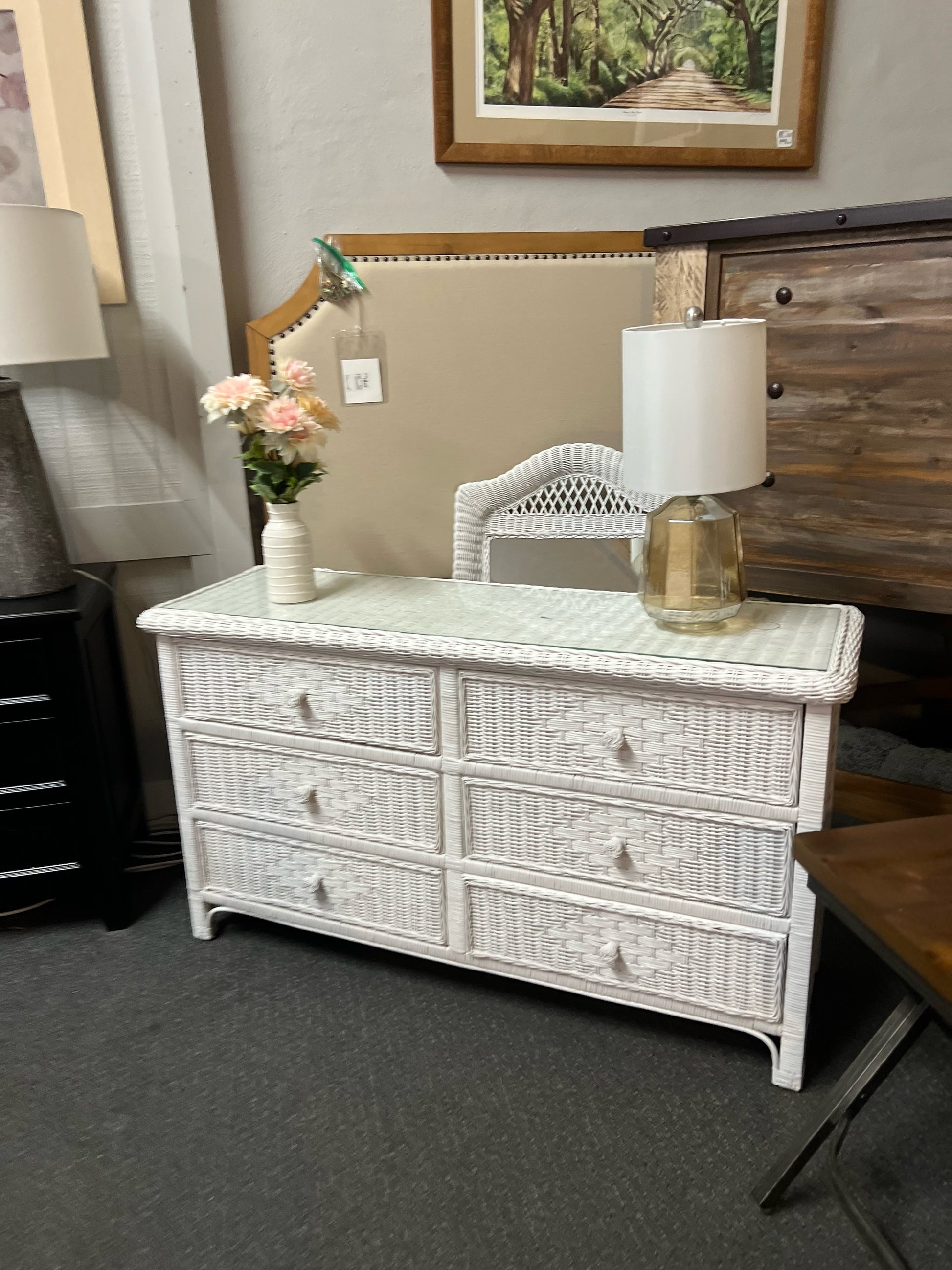 54X18X30 White Wicker 6 Drawer Dresser with Glass Top
